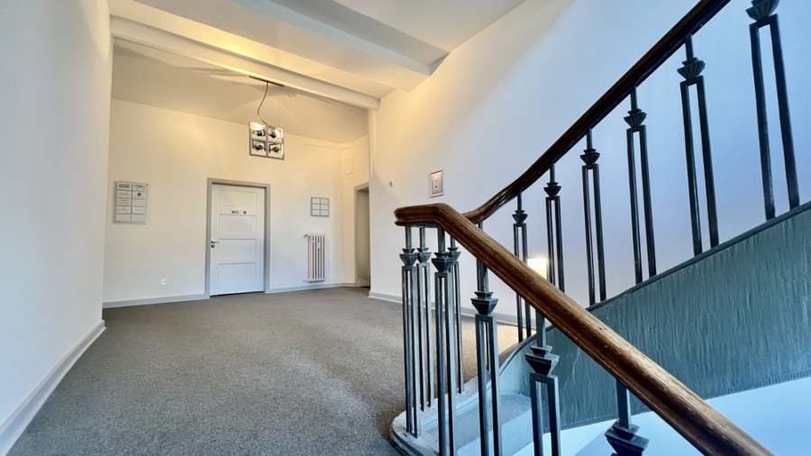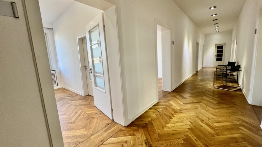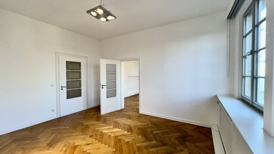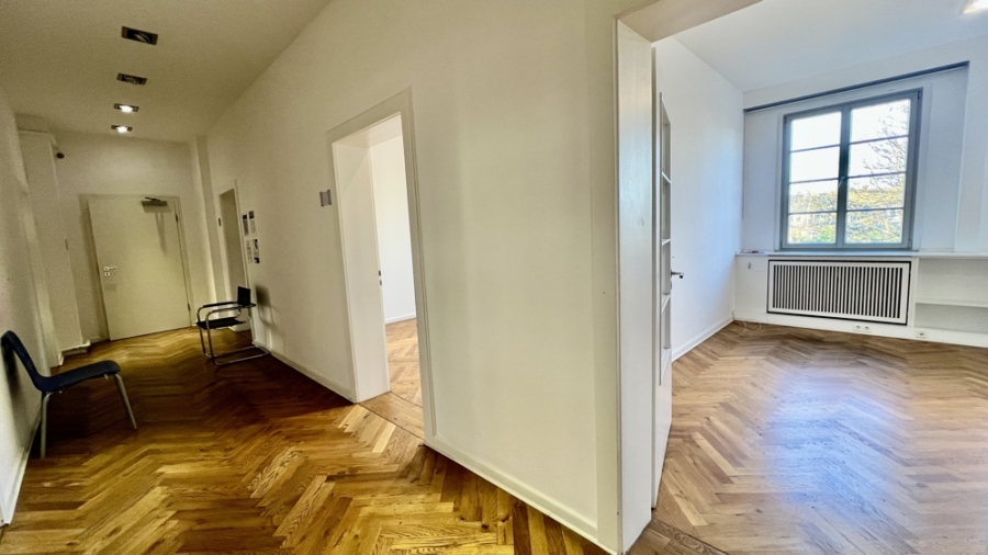 Das repräsentative Büro mit zwei Räumen befindet sich im 2. Obergeschoss. Die Gesamtfläche beträgt 36 m² mit der Option zwei weitere angrenzende Räume anzumieten bis 32 m² zusätzlicher Raum.