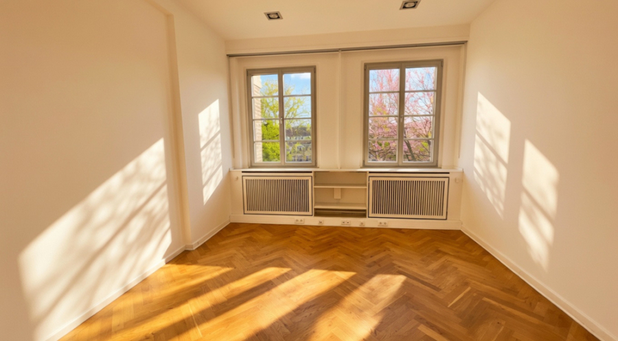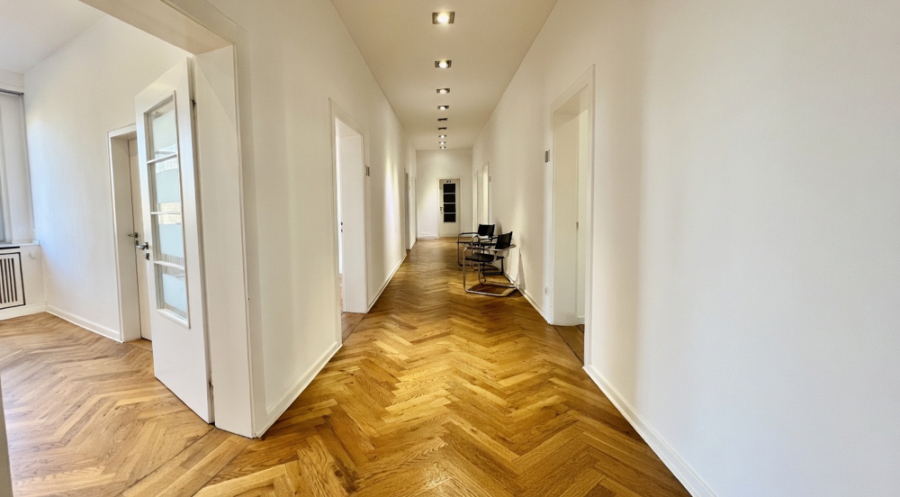 Die Räume, Flure und Nebenräume verfügen über Echtholzparkett, hohe Decken und große Fenster (Doppel ISO). Die Design-Deckenlampen und die gediegene Athmosphäre runden die hochwertige Ausstattung ab.
