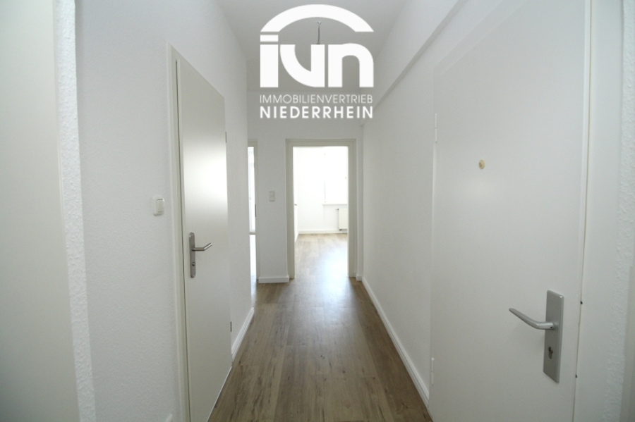 Das Wohnzimmer befindet sich zur vorderen Gebäudeseite, eines der beiden Schlafzimmer in ruhiger Hoflage. Ein geräumiger Flur verbindet die Wohnräume, und das Duschbad befindet sich im Mittelpunkt der Wohnung.