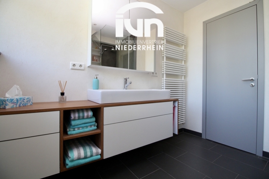 befinden sich 2 Schlafzimmer und sowie großes, modernes Duschbad. Der Platz und die Anschlüsse für die Waschmaschine und den Wäschetrockner ist im Bad vorgesehen.