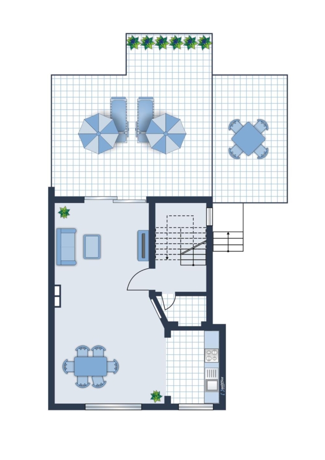 Zur Gartenseite liegend, erstreckt sich eine sonnige 43m² große Terrasse, diese erreichen Sie durch das Wohnzimmer. Eine elektrisch steuerbare Markise schützt Sie vor starker Sonneneinstrahlung. Die Terrasse ist mit Bankrai-Dielen belegt (auf dem Foto nicht abgebildet). Es steht ein Wasseranschluss zum wässern der Terrassenpflanzen zur Verfügung.